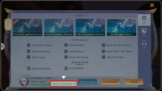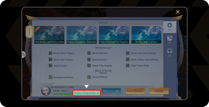 2. In the lower left corner of the screen,you can tap "Copy Character ID"