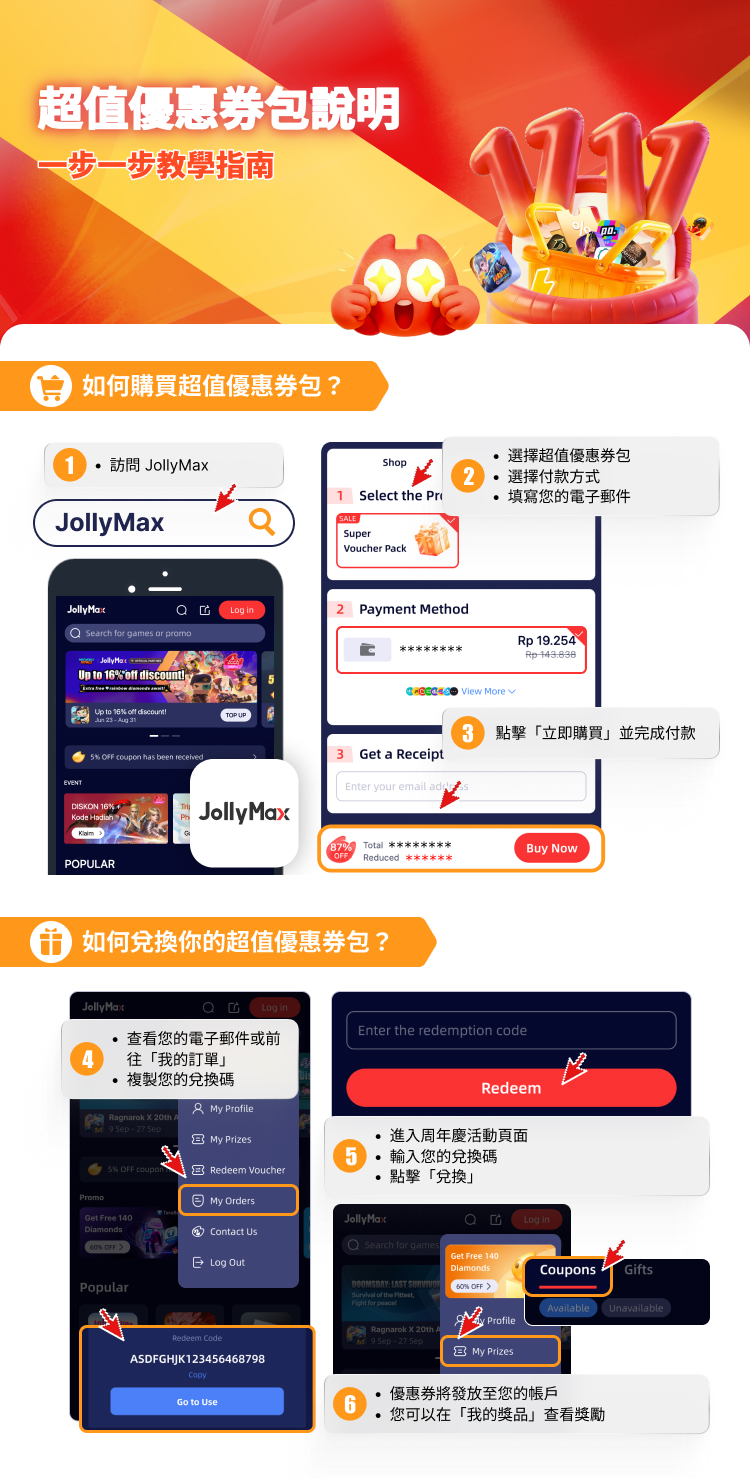 與 JollyMax 一起慶祝 11.11!🎉活動期間:11 月 11 日至 11 月 21 日,解鎖兩款專屬優惠券組,享受超值折扣與即時優惠!
